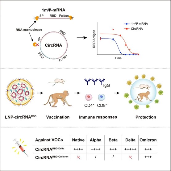 以上結(jié)果表明,針對新冠病毒德爾塔變異株設(shè)計的circRNARBD-Delta疫苗是具有廣譜保護力的新冠肺炎候選疫苗,該研究也為針對當(dāng)前新冠變異株迅速傳播的疫苗研發(fā)和接種策略提供了參考依據(jù)。同時,該項平臺型技術(shù)的建立在感染性疾病、自身免疫病、罕見病以及癌癥的預(yù)防或治療中具有廣泛的應(yīng)用前景。