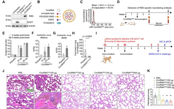 圖2 CircRNA疫苗接種在小鼠和恒河猴體內(nèi)提供了顯著性保護