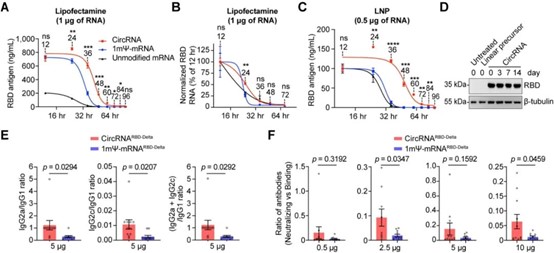 一系列的對比評估表明,與mRNA疫苗相比,circRNA疫苗具有以下特點或優(yōu)勢(圖3):1)circRNA具有更高的穩(wěn)定性,可以在體內(nèi)產(chǎn)生更高水平、更加持久的抗原;2)circRNA疫苗誘導(dǎo)機體產(chǎn)生的中和抗體比例更高,可以更有效地對抗病毒變異,降低疫苗潛在的抗體依賴增強癥(ADE)副作用;3)circRNA疫苗誘導(dǎo)產(chǎn)生的IgG2/IgG1的比例更高,表明其主要誘導(dǎo)產(chǎn)生Th1型保護性T細(xì)胞免疫反應(yīng),可以有效降低潛在的疫苗相關(guān)性呼吸道疾病(VAERD,Vaccine-associated enhanced respiratory diseases)副作用。