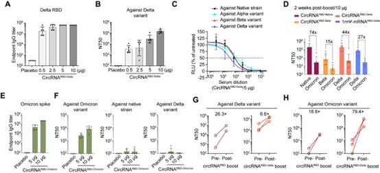 此外,在新冠病毒奧密克戎突變株被世界衛(wèi)生組織列為值得關(guān)注的變異株(Variants of Concern,VOC)后,研究團隊緊急啟動了針對該突變株的環(huán)狀RNA疫苗研發(fā)。在獲得病毒序列信息的30天內(nèi),完成了從疫苗生產(chǎn)、小鼠免疫到有效性評估的全流程。研究發(fā)現(xiàn),基于奧密克戎變異株的環(huán)狀RNA疫苗(circRNARBD-Omicron)的保護范圍狹窄,其誘導(dǎo)產(chǎn)生的抗體只能夠中和奧密克戎變異株。而針對德爾塔變異株設(shè)計的環(huán)狀RNA疫苗(circRNARBD-Delta)則可以在小鼠體內(nèi)誘導(dǎo)產(chǎn)生廣譜的中和抗體,有效中和包括奧密克戎株在內(nèi)的多種新冠變異株(圖4)。