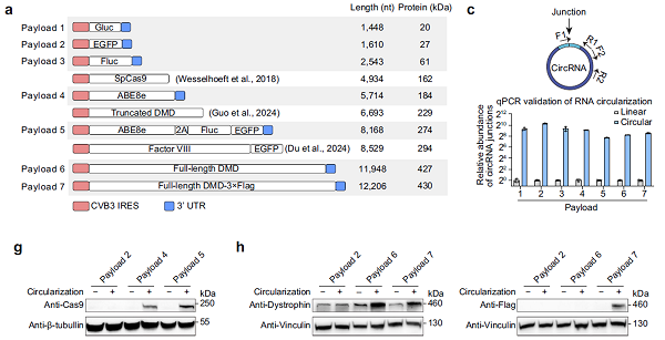 利用CIRC技術(shù),研究團(tuán)隊(duì)成功環(huán)化了編碼全長(zhǎng)肌營(yíng)養(yǎng)不良蛋白(約 12,206 個(gè)核苷酸)的 RNA,并實(shí)現(xiàn)了 427 KDa 蛋白的完整表達(dá)。這一重大突破,徹底打破了環(huán)化 RNA 編碼蛋白大小的限制,為大分子量蛋白缺失相關(guān)疾病的治療開(kāi)辟了全新路徑。