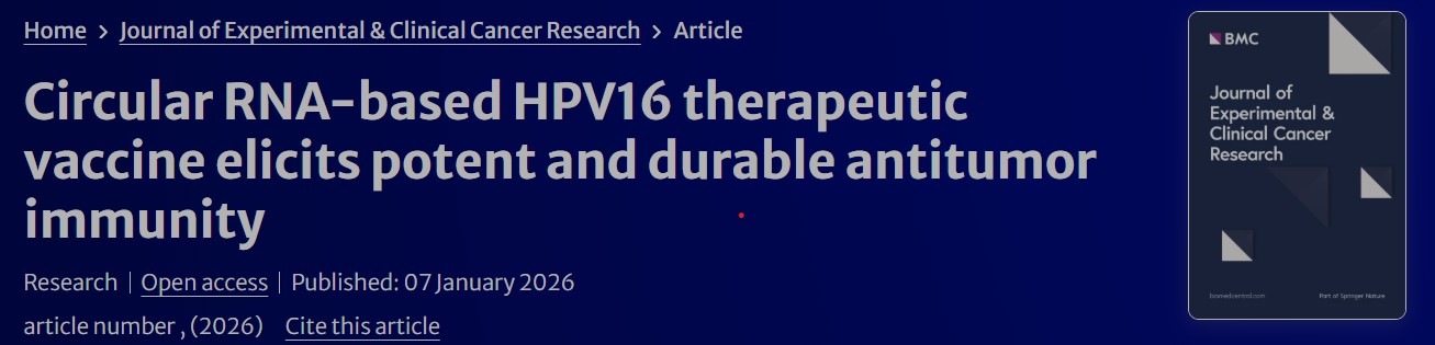圓因生物自主研發(fā)的HPV相關(guān)腫瘤治療性疫苗TI-0093已于去年正式開啟在HPV16 陽性晚期復發(fā)或轉(zhuǎn)移性實體瘤患者的中臨床一期研究。作為全球首個進入腫瘤治療領(lǐng)域臨床階段的環(huán)狀RNA藥物,其早期研發(fā)核心成果以《Circular RNA-based HPV16 therapeutic vaccine elicits potent and durable antitumor immunity》為題,于2026年1月7日發(fā)表于國際知名期刊《Journal of Experimental & Clinical Cancer Research》(《實驗與臨床癌癥研究雜志》,簡稱J Exp Clin Cancer Res)。