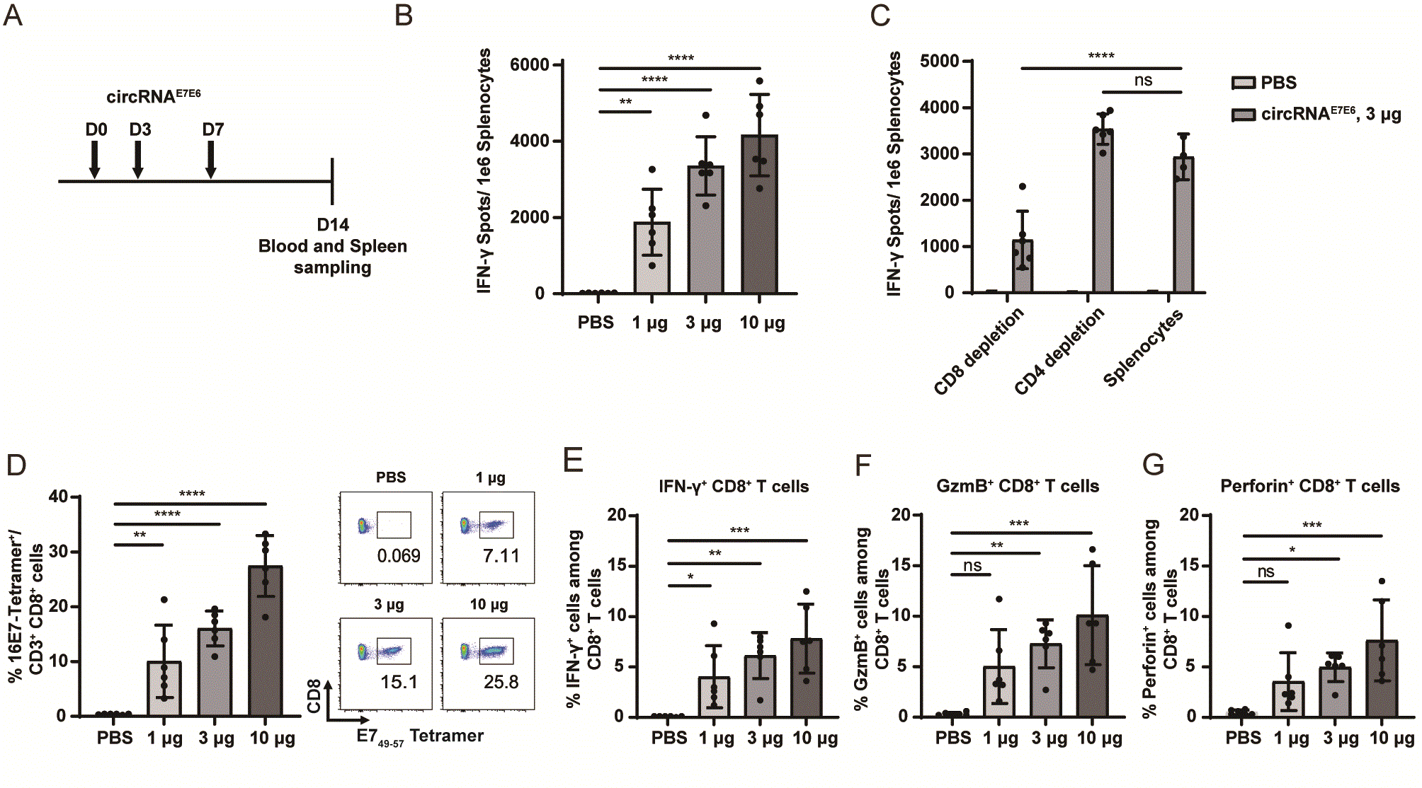 該研究依托圓因生物自主研發(fā)的環(huán)狀RNA技術(shù)平臺,采用創(chuàng)新設(shè)計策略構(gòu)建編碼突變及免疫增強修飾型HPV16 E7/E6融合抗原的circRNAE7E6通過脂質(zhì)納米顆粒(LNP)遞送系統(tǒng)經(jīng)肌肉注射給藥。臨床前研究結(jié)果顯示,在C57BL/6小鼠模型中,circRNAE7E6可劑量依賴性誘導脾細胞產(chǎn)生抗原特異性IFNγ,顯著提升外周血中HPV16 E7特異性CD8? T細胞占比,并增強抗原特異性細胞毒性T淋巴細胞(CTL)中IFN-γ、穿孔素(PRF1)及顆粒酶B(GzmB)等關(guān)鍵效應分子的表達。上述數(shù)據(jù)證實,circRNAE7E6可在小鼠體內(nèi)高效誘發(fā)針對HPV的特異性細胞免疫應答。