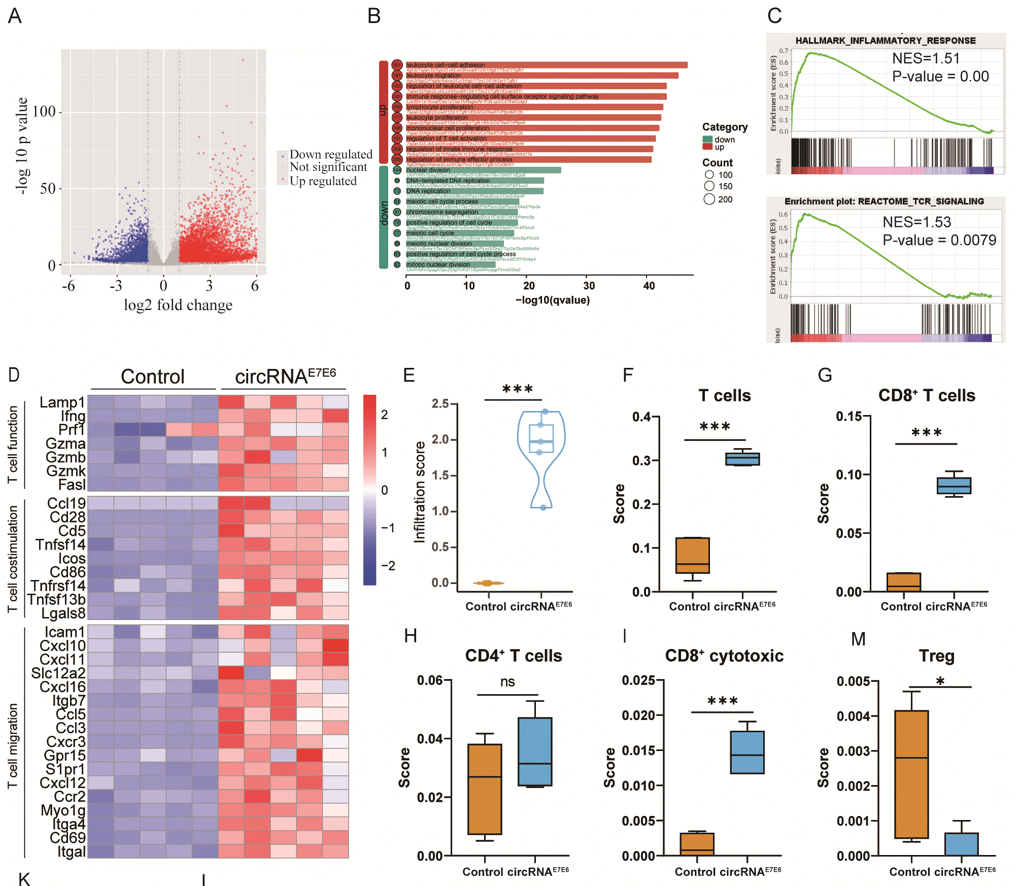 在小鼠腫瘤模型研究中,研究團隊為免疫功能正常小鼠皮下接種TC-1腫瘤細胞后,采用circRNAE7E6進行免疫干預,待腫瘤體積達到預設(shè)標準后采集腫瘤組織開展測序分析。RNA-Seq結(jié)果表明,circRNAE7E6可在腫瘤微環(huán)境中誘導強效抗腫瘤免疫反應,實現(xiàn)腫瘤局部活躍的免疫浸潤,具體表現(xiàn)為免疫激活基因顯著上調(diào)、免疫細胞大量浸潤,以及腫瘤微環(huán)境向促炎狀態(tài)偏移。